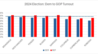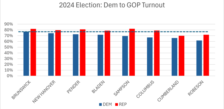 This graph is typical of District 7 elections. Republicans vote while Democrats stay home. In 2024, Brunswick County was the only county in our district to meet the state average in Democratic voter turnout, while Republicans exceeded the average in six of our eight counties.